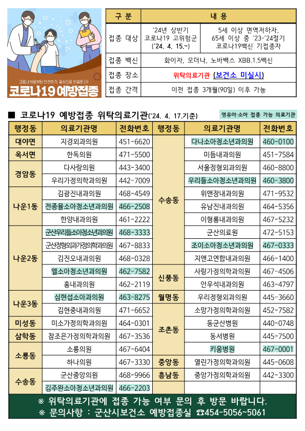 648 '24년 상반기 코로나19 고위험군 예방접종 위탁의료기관 현황(39개소) 다운받기 감염병관리과 24.04.03 3224