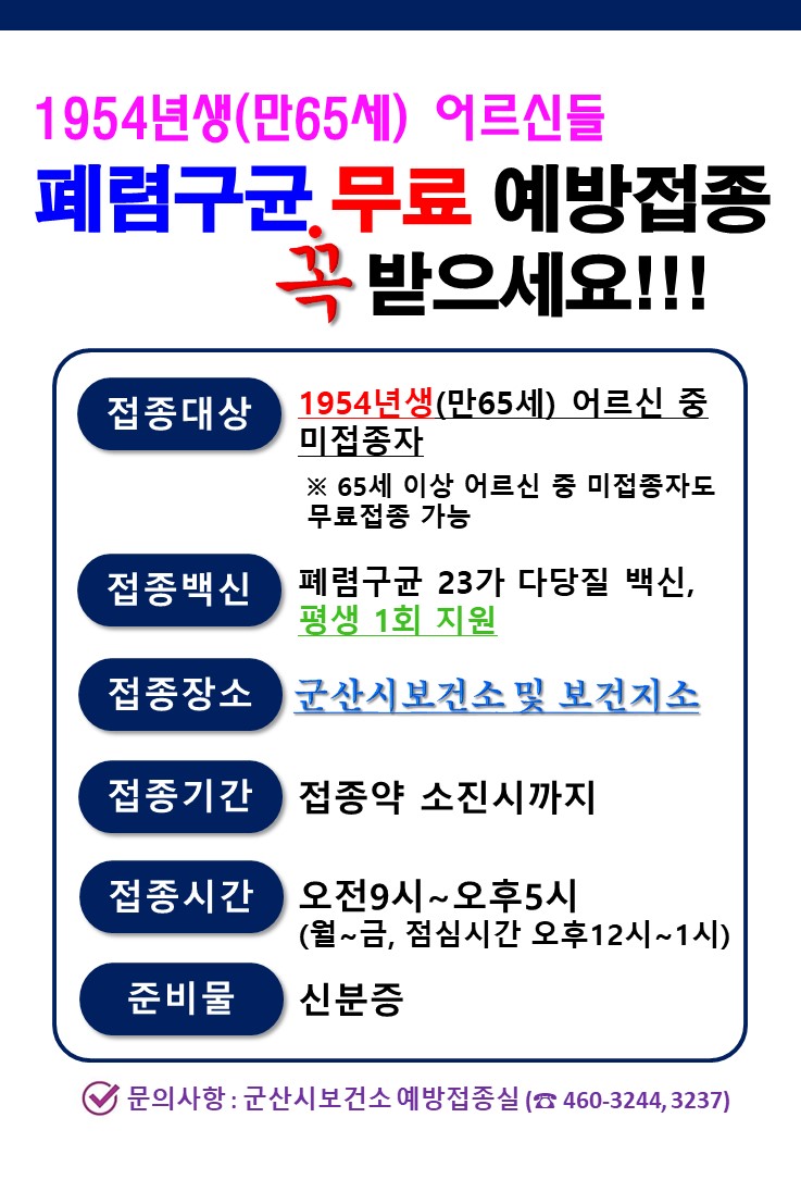 55 54년생(만 65세) 어르신 폐렴구균 무료예방접종 시행 안내 다운받기 건강관리과 19.06.05 2118