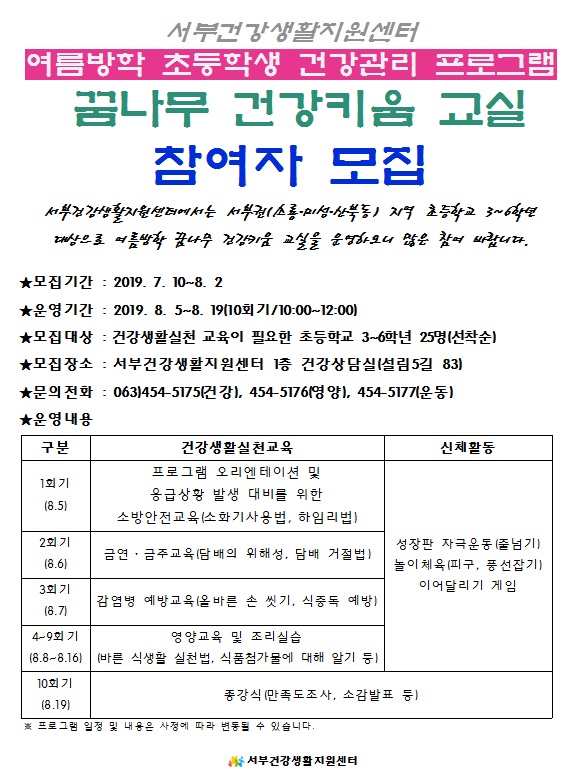 61 서부건강생활지원센터 여름방학 꿈나무 건강키움 교실 참여자 모집 다운받기 건강관리과 19.07.09 2107