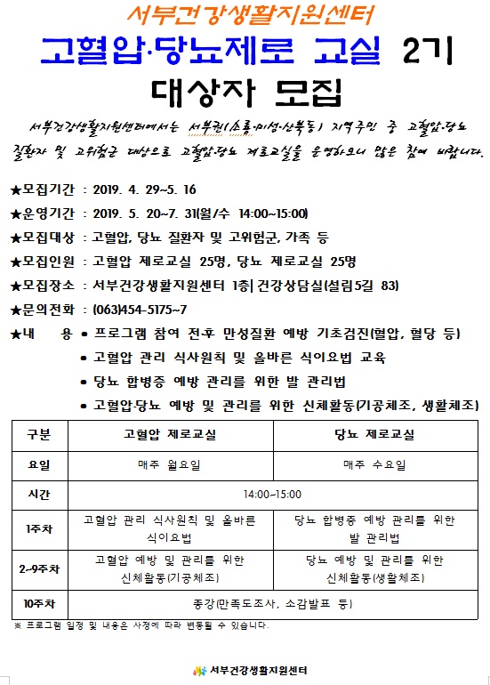 44 서부건강생활지원센터 고혈압 당뇨 제로교실 대상자 모집 다운받기 건강관리과 19.05.01 2270