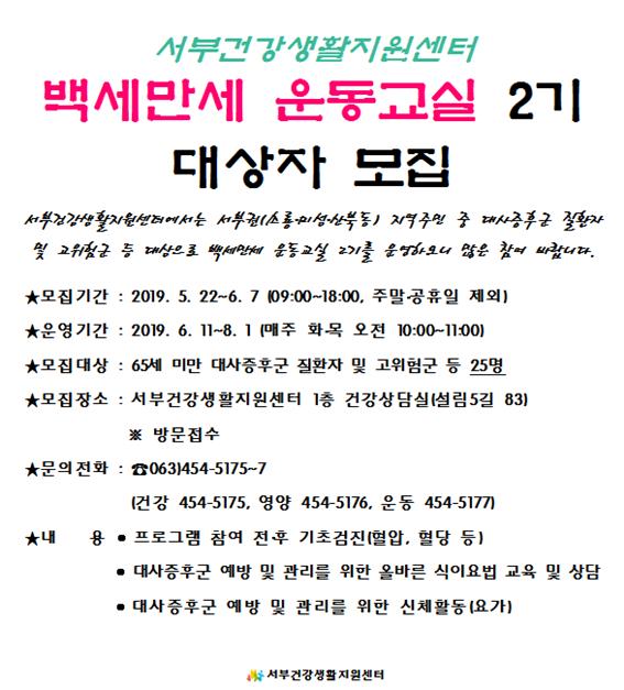 45 서부건강생활지원센터 백세만세 운동교실 2기 대상자 모집 다운받기 건강관리과 19.05.22 2112