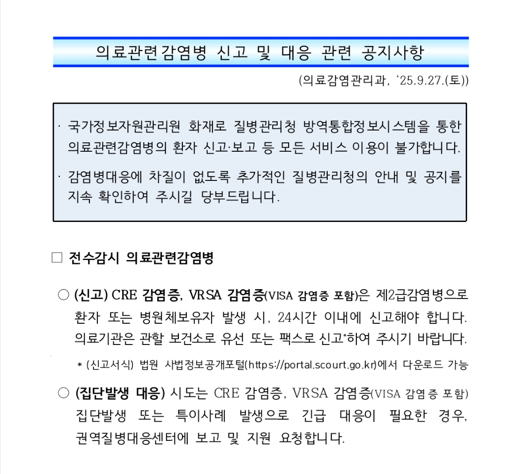 2. 대전 국가정보자원관리원 화재로 인해 정보시스템 운영에 어려움이 발생하여, 방역통합관리시스템을 통한 감염병 발생 보고 등에 차질이 우려됩니다.