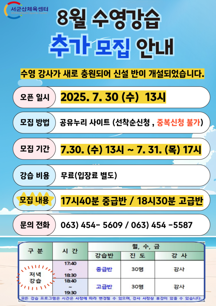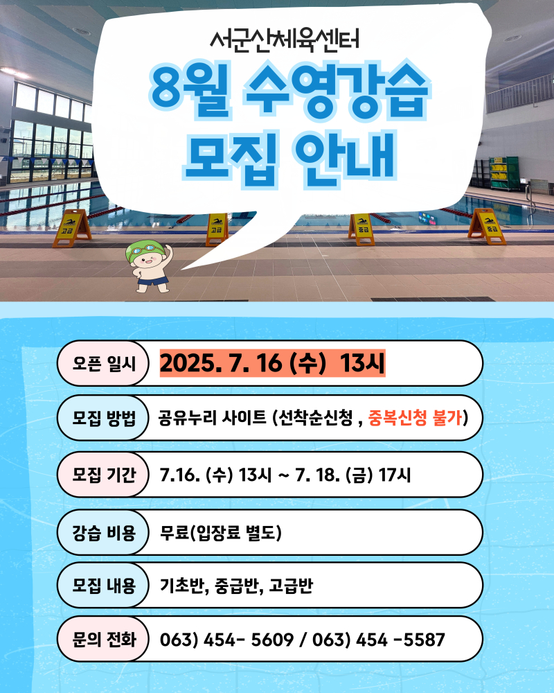 | 208 | 서군산체육센터 8월 수영강습 추가모집(신설반) |