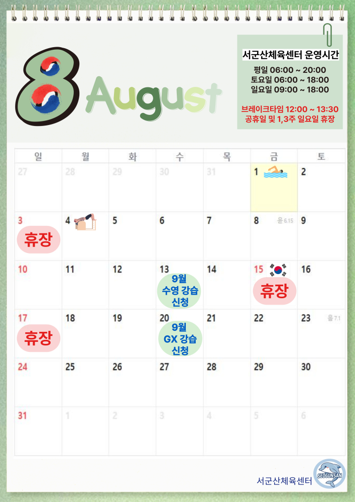 | 209 | 서군산체육센터 8월 일정 달력 |