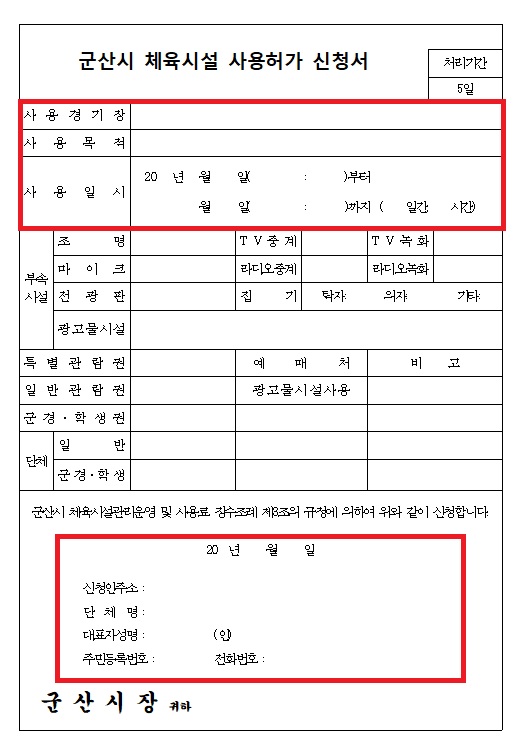 대관신청시 아래의 파일 참고하시어 [군산시 체육시설 사용허가 신청서] 작성하여 대관신청 부탁드립니다.