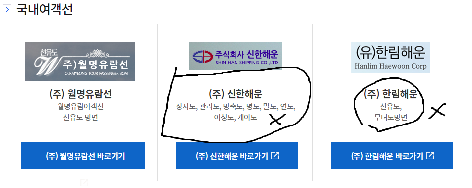시 홈페이지 생활복지 - 교통안내 - 철도/항공/여객선 여객선 정보가 잘못되어 (예전) 있는것 같아서 확인요청