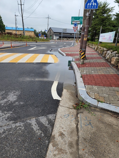 학교 정문 앞 도로에 물이 고여있어
