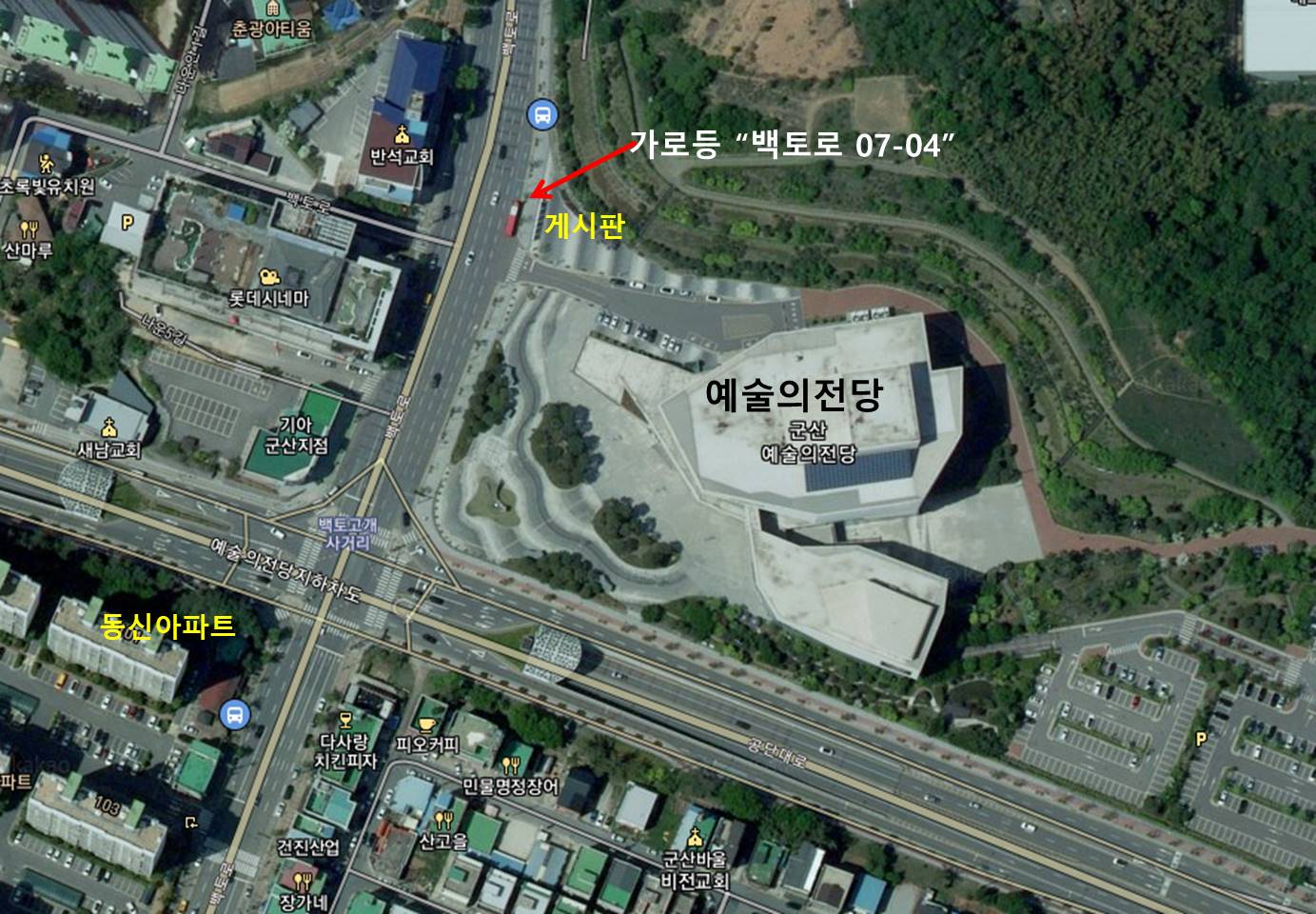 (1)군산 예술의 전당 게시판 앞 가로등 하나가 램프 불빛이 점멸상태(꺼졌다 켜졌다 반복)
