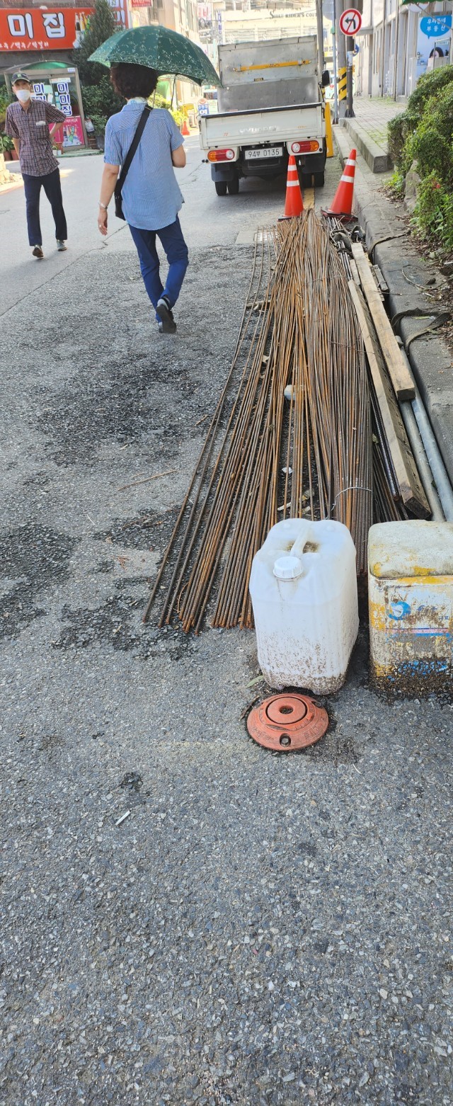 첫째, 주민들이 많이 다니는 도로변에 철근을 방치하여 사고의 위험으로 주민들이 불안해 하고 있으며,