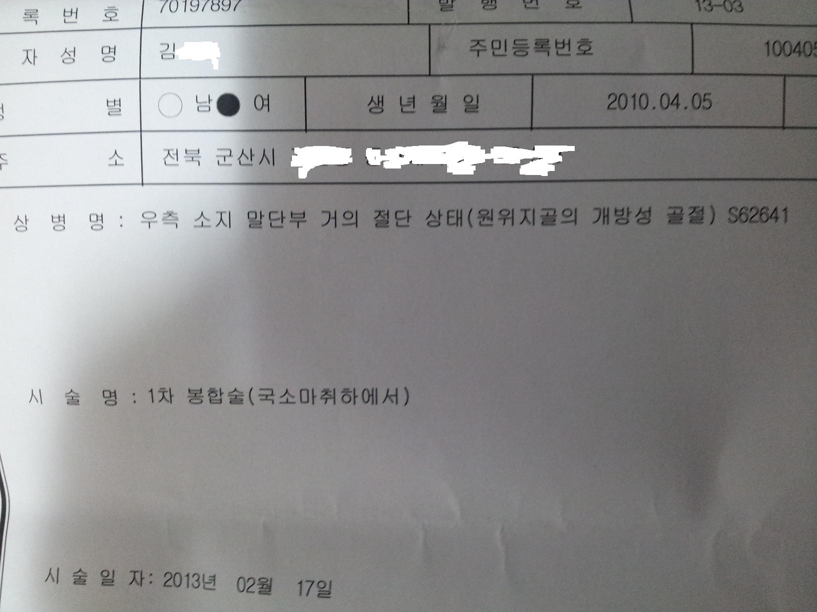 얼마전 4세 딸아이가 화장실문에 오른쪽 새끼손가락이 거의절단되서 동군산병원에서 봉합수술을 받았습니다.