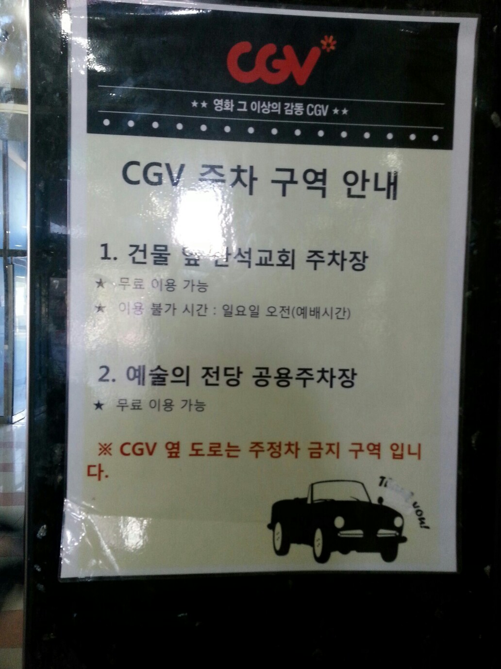 예술의 전당에 씨지브이 영화관의 무분별한 주차권장을 막아주시길 바라며
