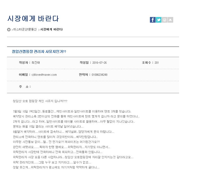 o 청암산 오토캠핑장 이용에 불편을 드려 죄송합니다. o 무더운 날씨에 가족과 함께 즐거운 휴식이 될 수 있도록 최선의 노력을 다하겠습니다. o 오토캠핑장을 이용하시는 모든 분들이 이용 규칙을 충분히 이해하시고, 운영자 규칙에 따라 즐겁게 사용하셨으면 하는 것이 담당부서 직원의 마음입니다. 현지 오토캠핑장 운영자에게 사용접수 사이트를 해제해 줄 것을 당부드렸으니, 직접 오토캠핑장 사무실에 연락주시면 감사하겠습니다. |