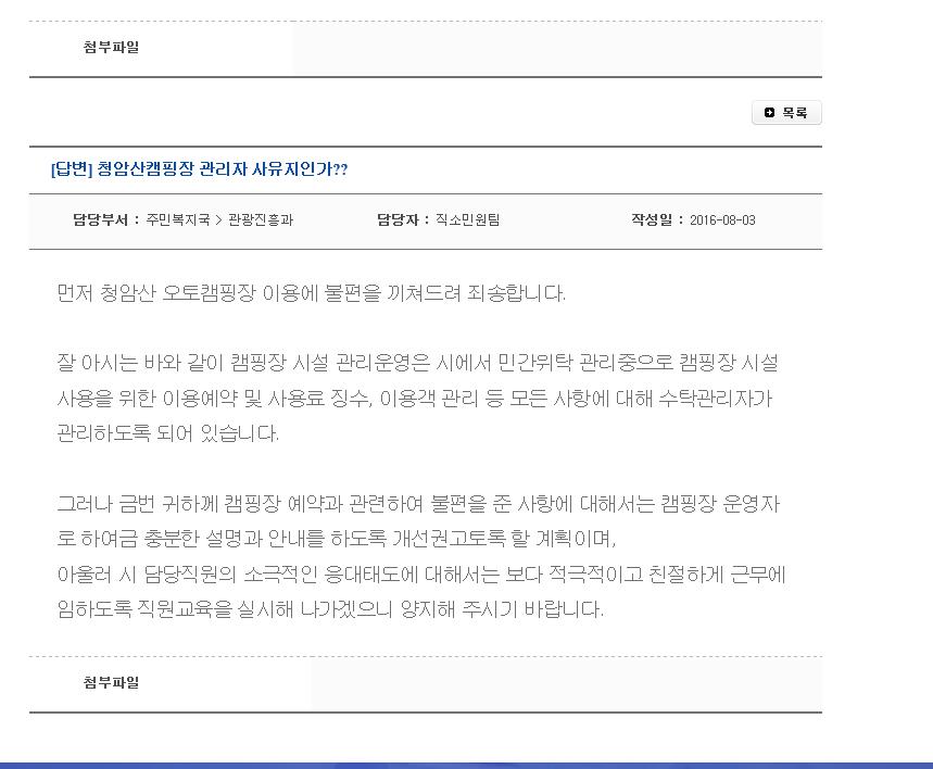 청암산 오토캠핑장 이용에 불편을 드려 죄송합니다. 무더운 날씨에 가족과 함께 즐거운 휴식이 될 수 있도록 최선의 노력을 다하겠습니다. 오토캠핑장을 이용하시는 모든 분들이 이용 규칙을 충분히 이해하시고, 운영자 규칙에 따라 즐겁게 사용하셨으면 하는 것이 담당부서 직원의 마음입니다. 현지 오토캠핑장 운영자에게 사용접수 사이트를 해제해 줄 것을 당부드렸으니, 직접 오토캠핑장 사무실에 연락주시면 감사하겠습니다. |