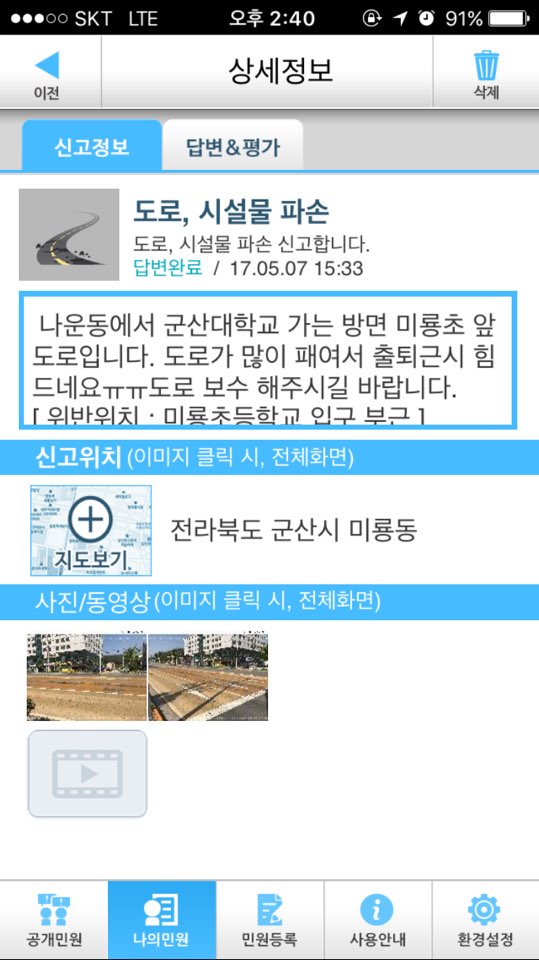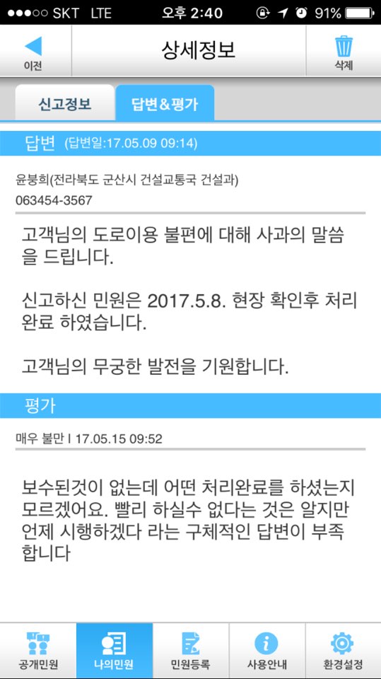 처리되지도 않은 민원을 처리되었다고 대충 답변달고. 민원 올린 시민은 뭐가 해결됬나 다시 또 한번 가보고