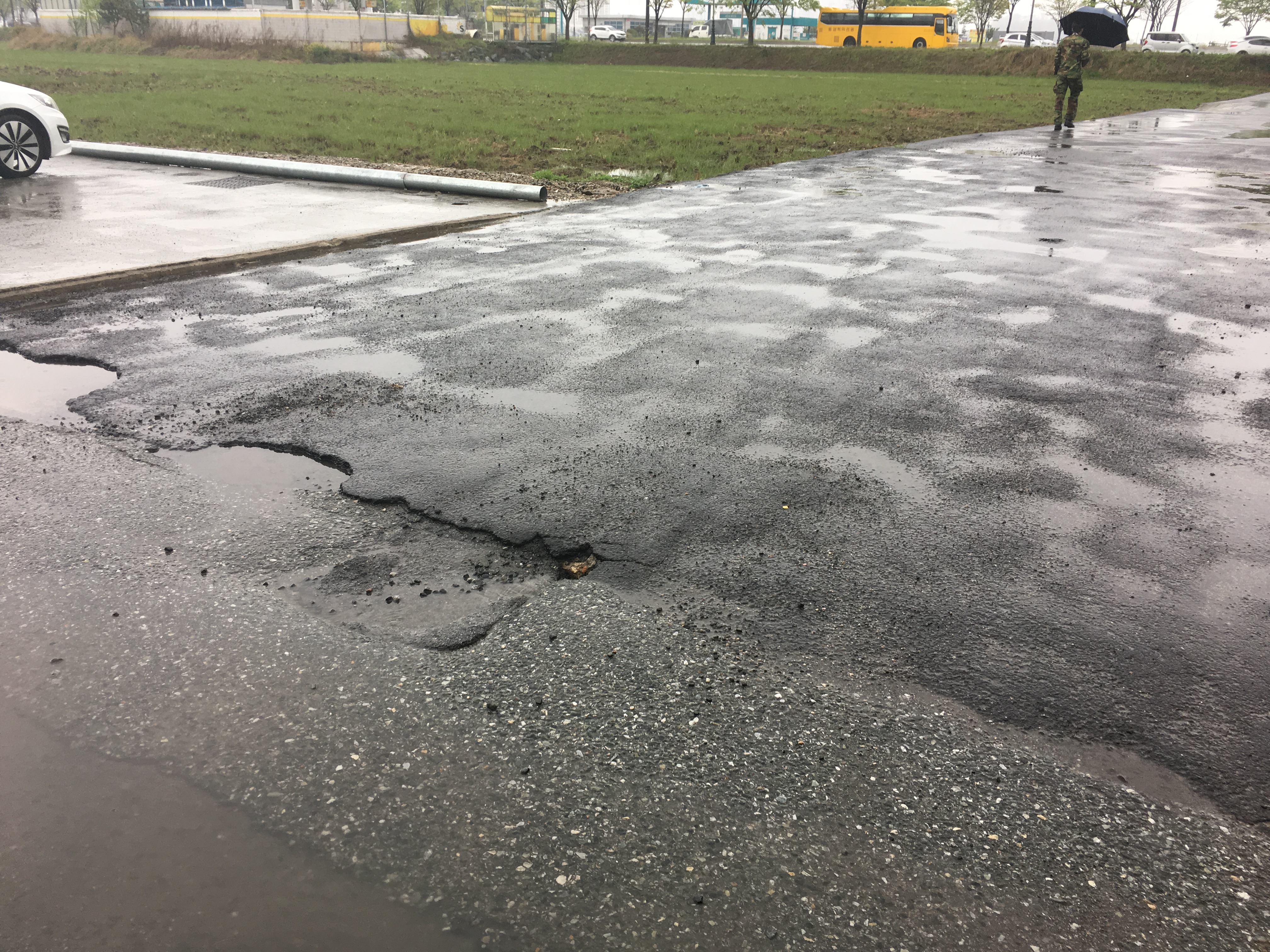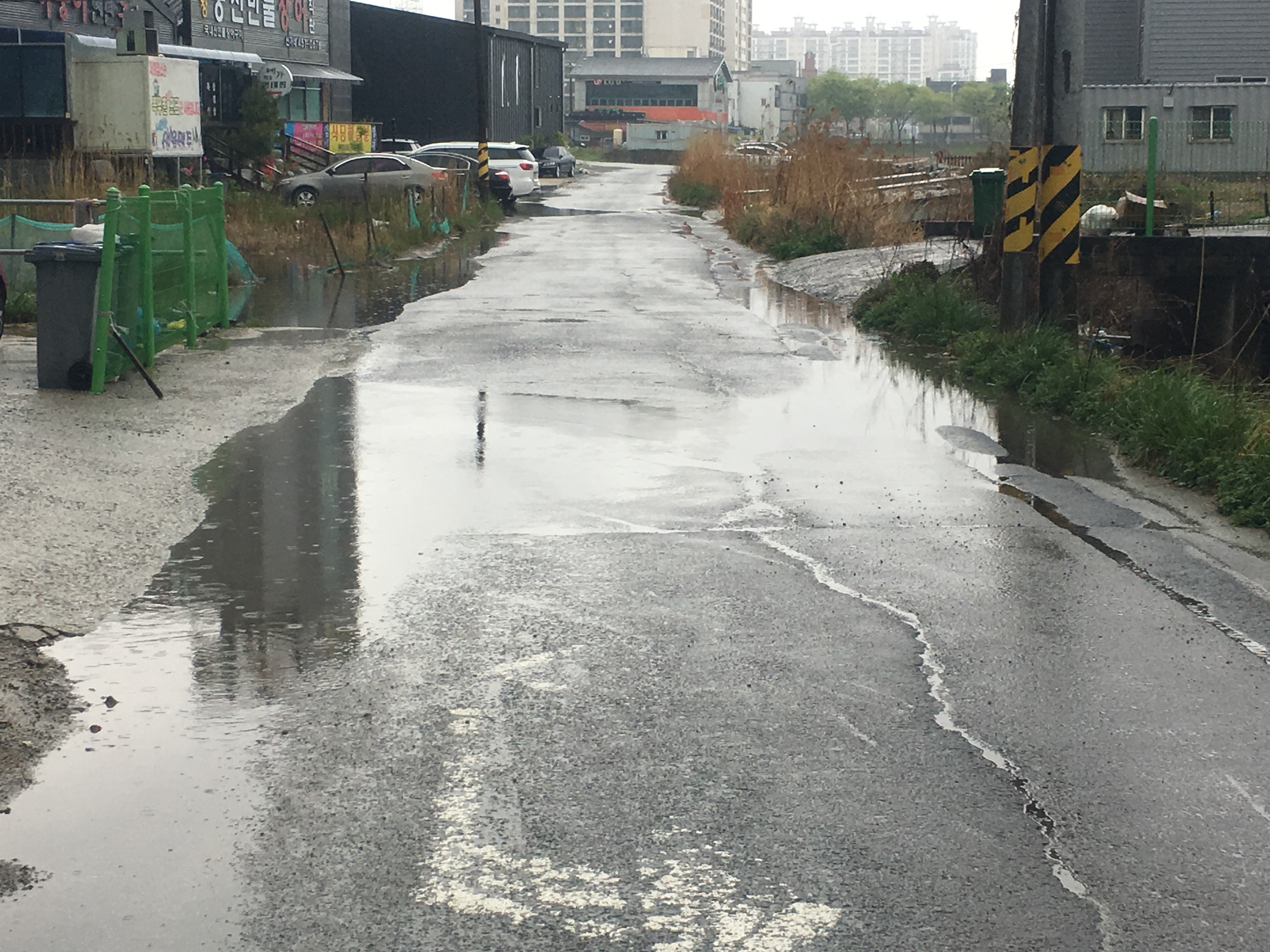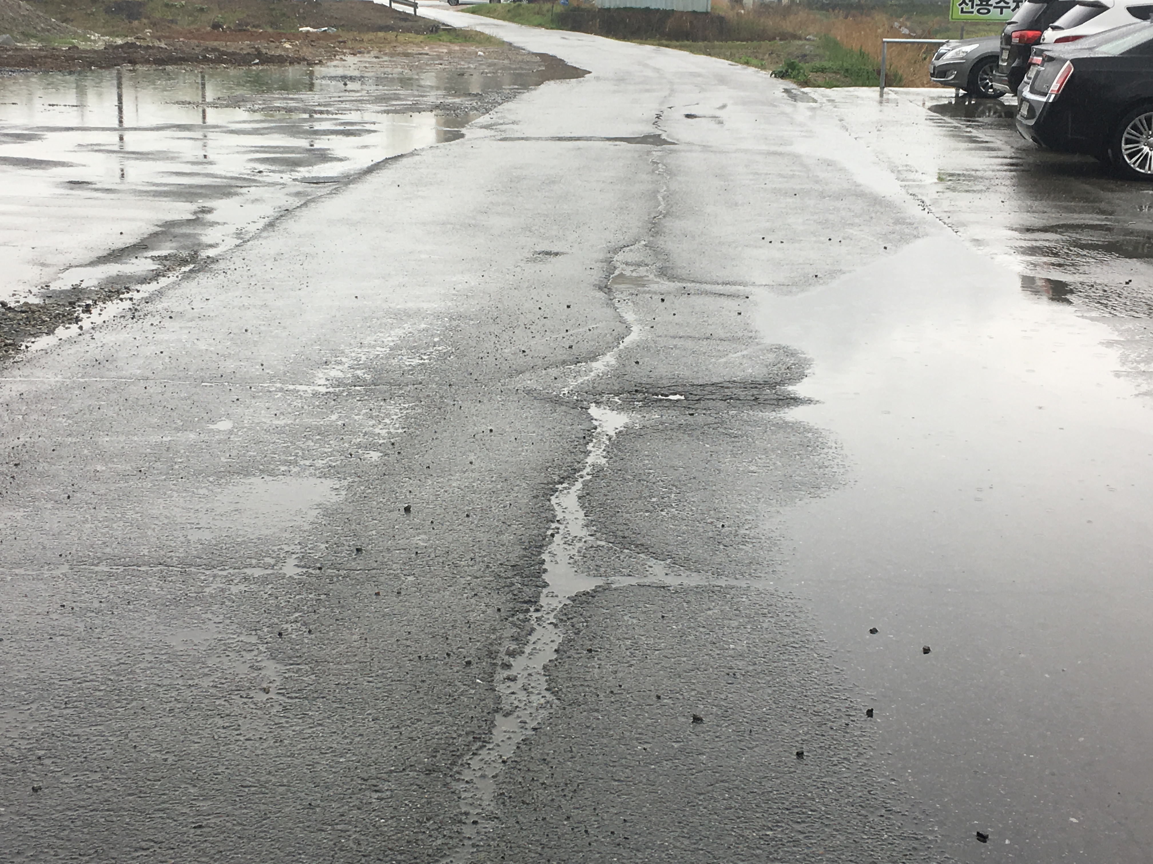 그런데 길은 좁은데다가 오래된 아스팔트부분은 갈라지거나 패인부분도 많고 비포장이 된곳이 많아서 도보로 이동시 먼지가 너무 많이 날리고 비가 오는 날은 움푹 파인곳 때문에 많은분들이 이동에 불편함을 느낍니다. 또한 바로 옆이 도랑이라 차 두대가 겹치면 위험하기까지 합니다.