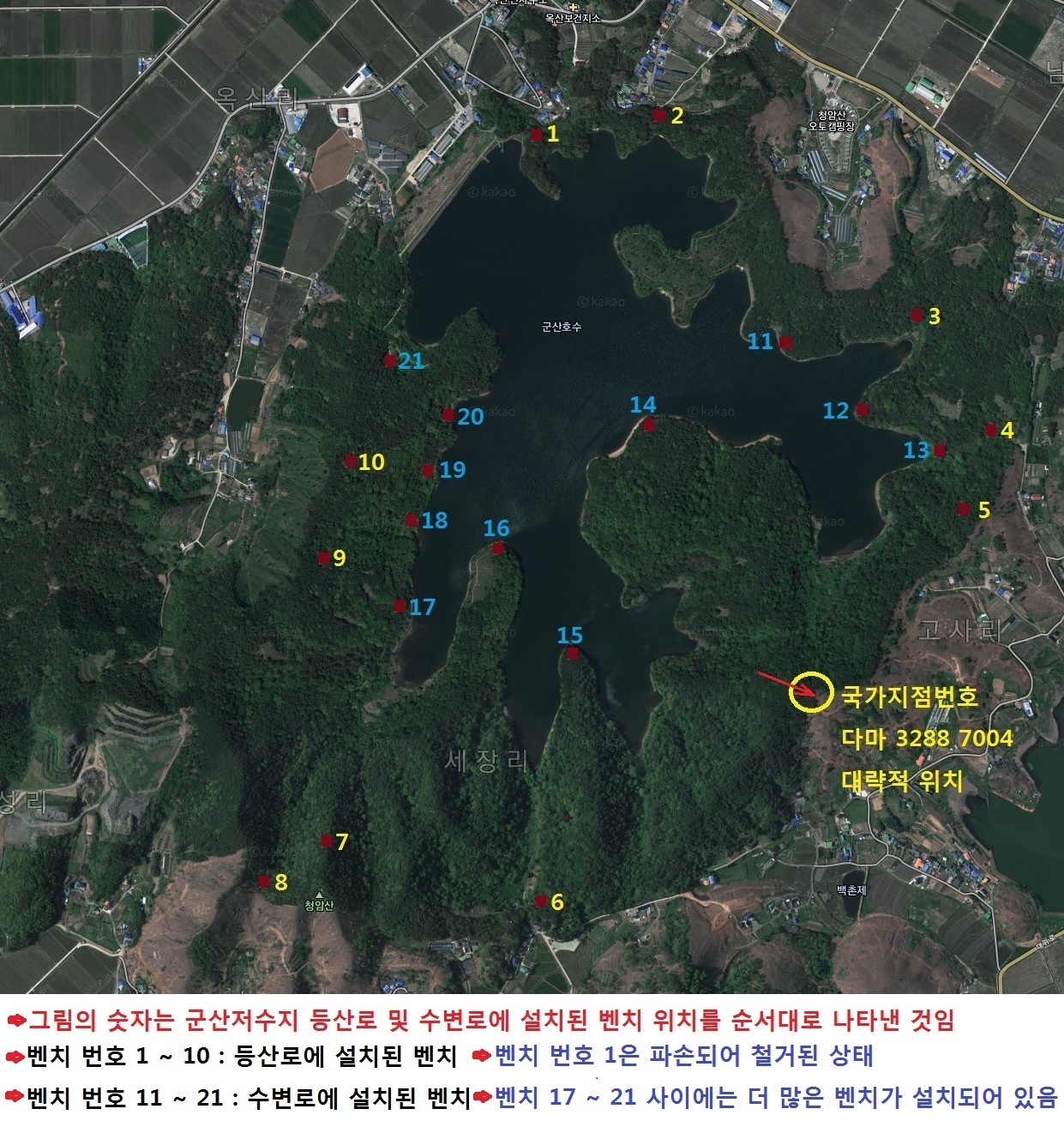 정확하지는 않지만 군산저수지 주변 등산로 및 수변로에는 첨부 그림과 같은 위치에 벤치가 설치되어 있습니다