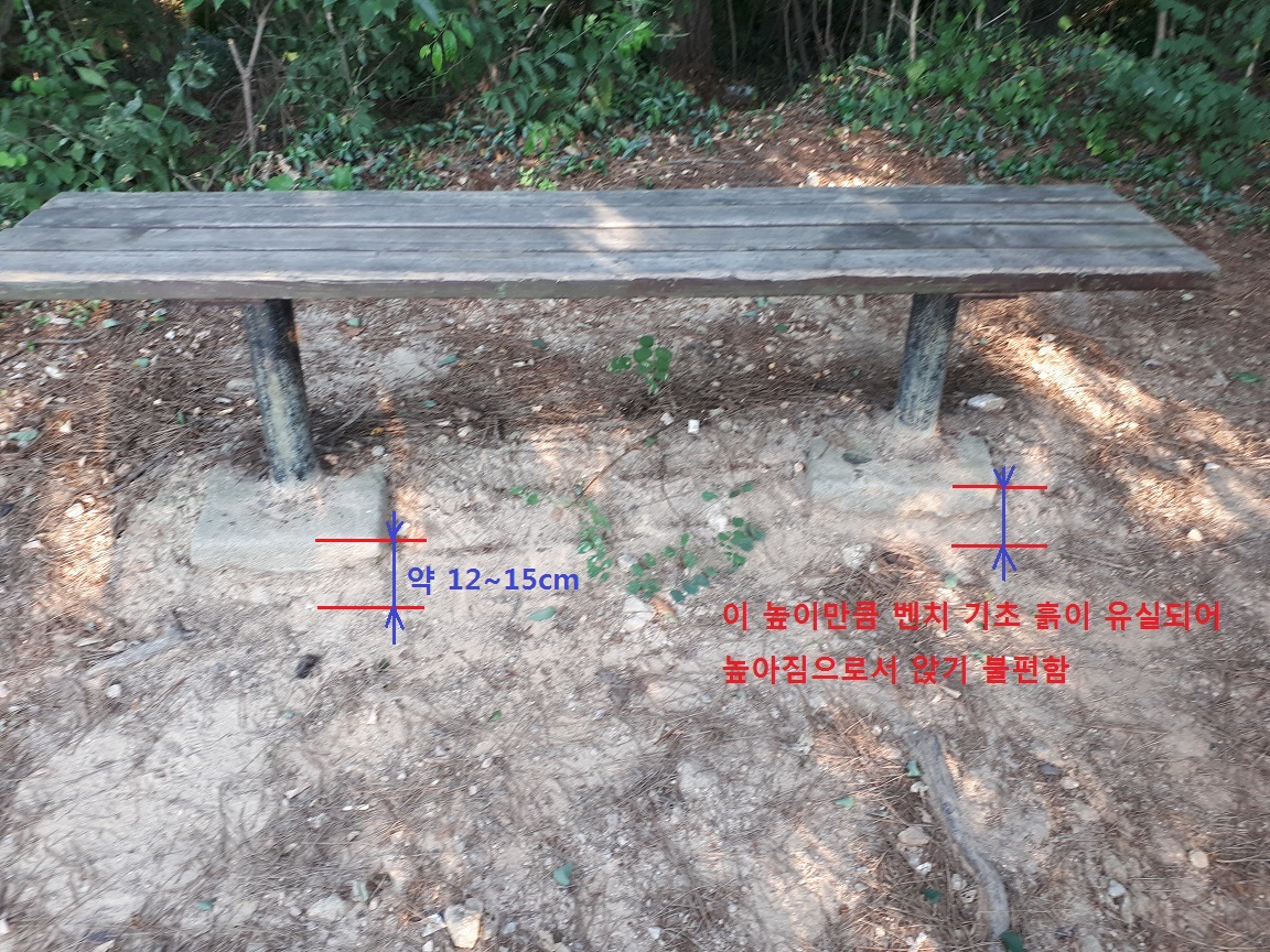 벤치 높이가 톺아져 사람이 앉으면 발이 “붕”뜨게 되어 다리가 저려오는 등 불편하기 그지 없습니다