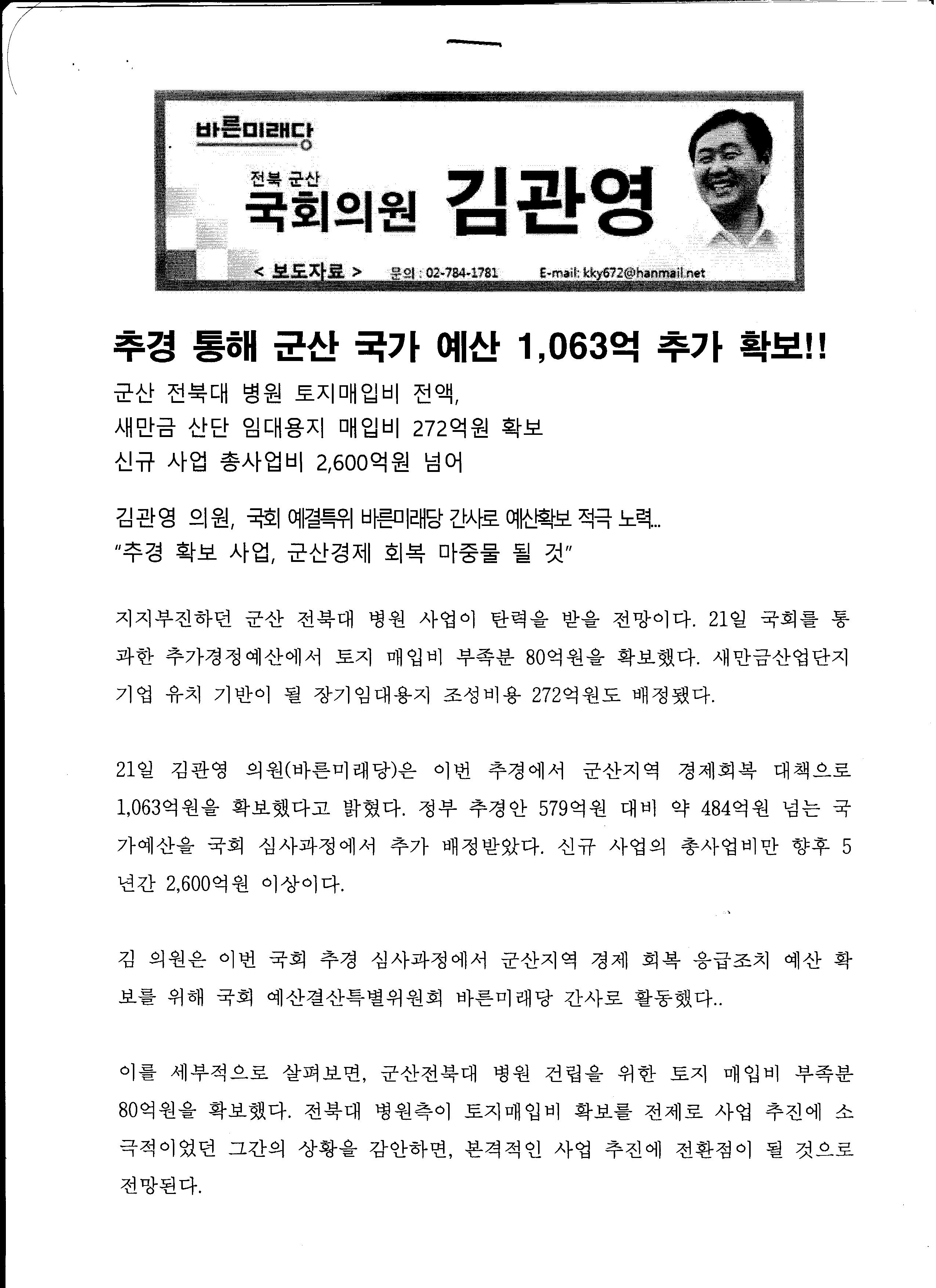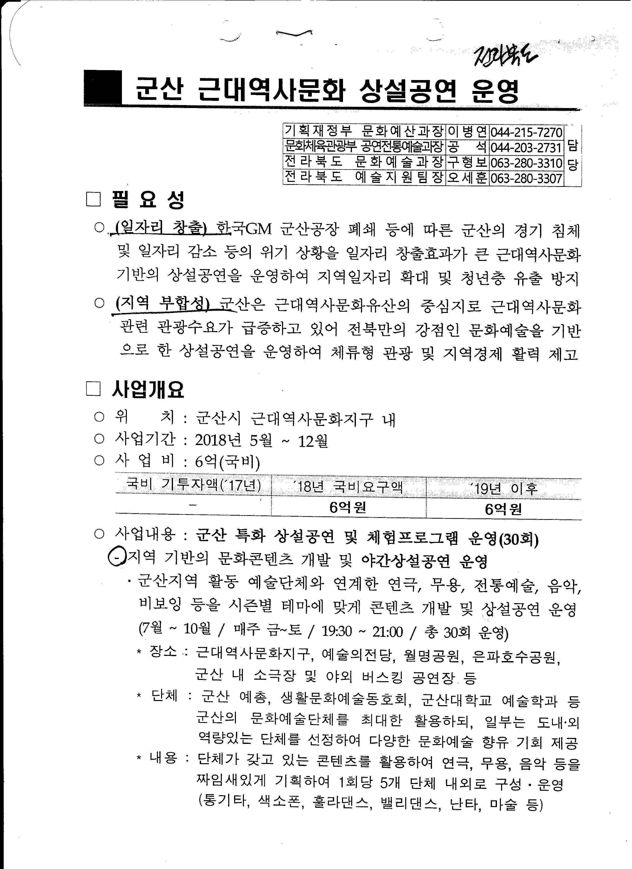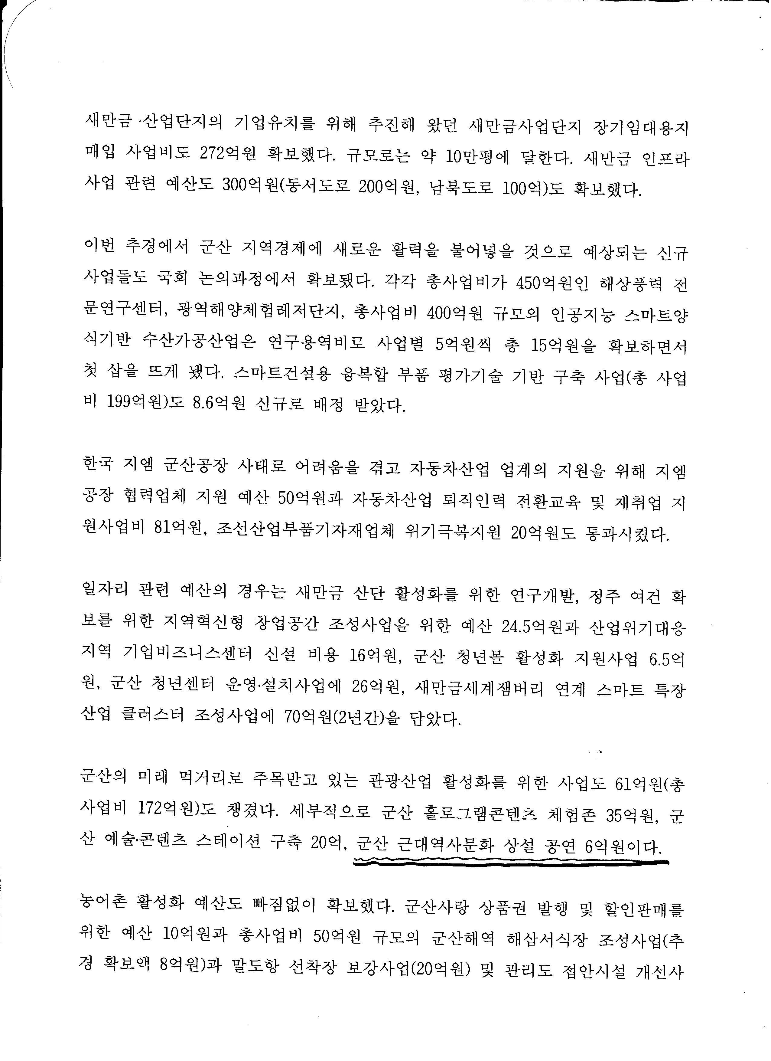 주시기 바랍니다. 저는 이 예산을 군산시로 찾아오기 위하여 다방면으로 노력하였고 현재 도청과 전북문화관광