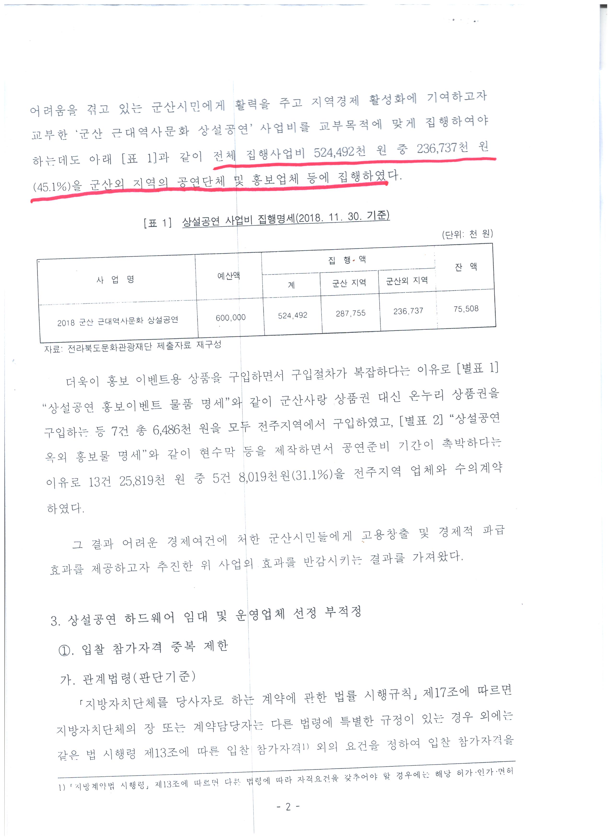 군산 근대역사문화 상설공연은 한국지엠 군산공장 폐쇄 등으로 어려움을 겪고있는 군산시민에게 활력을 주고 지역경제 활성화에 기여하고자 문화체육관광부가 전라북도 문화관광재단을 통하여 사업비 전액을 집행한 행사로서, 군산시는 본 상설공연사업과 직접적인 관련이 없습니다. 기타 궁금하신 사항이 있으시면 문화예술과(454-3272)로 연락주시기 바랍니다.