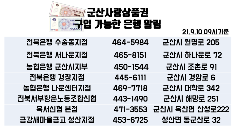 | 100 | 군산사랑상품권 (종이류) 구입 가능한 은행 알림 (21.09.13. 09시기준) |