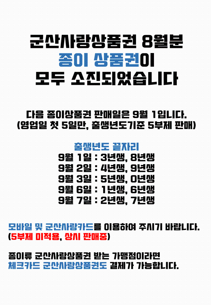 | 94 | 군산사랑상품권 (종이류 8월) 소진되었습니다 |
