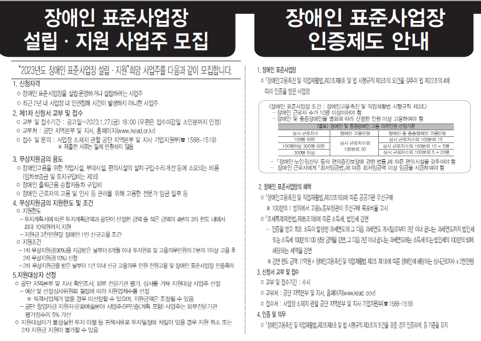 이에 장애인 근로자를 신규 고용하려는 역량있는 기업 등이 기한내(~2023.01.27.) 많이 신청하여 선발될 수 있도록 홍보하고자 하오니 자세한 내용은 첨부파일을 참고하여 주시기 바랍니다.