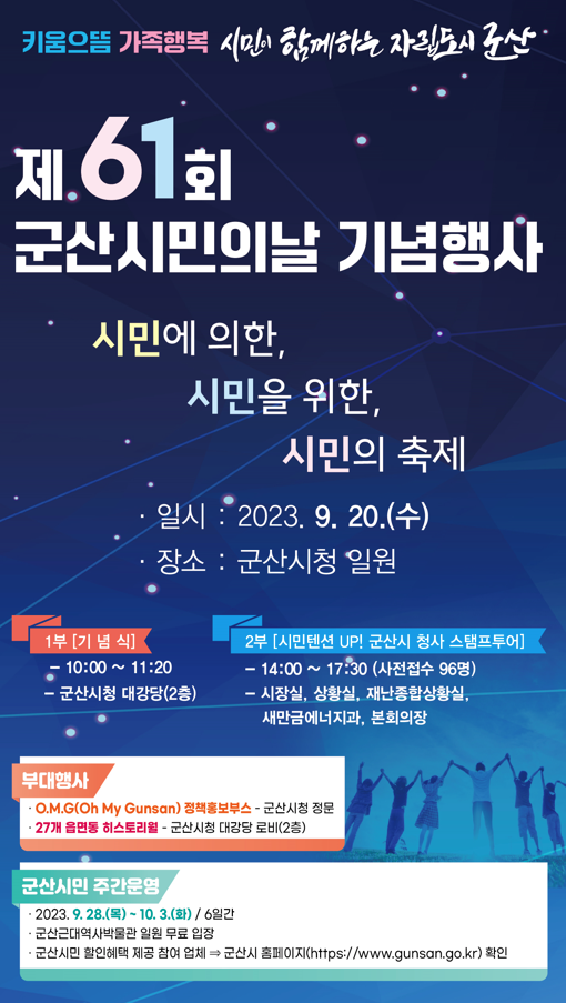 많은 참여 부탁드리며, 아울러 9. 28.(목)~10. 3.(화) / 6일간 군산시민주간이 운영되오니,