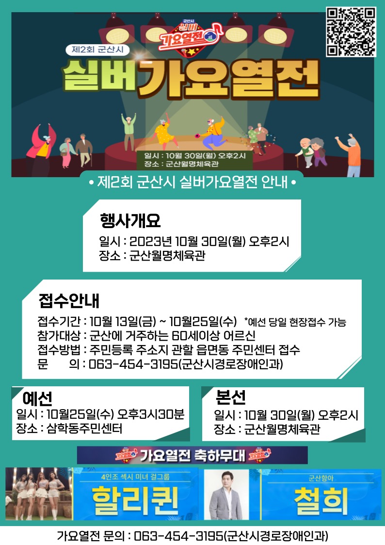 1. 군산시 어르신 문화행사 「제2회 군산시 실버가요열전」 추진에 따라 행사 참가자를 아래와 같이 모집하고자 하오니