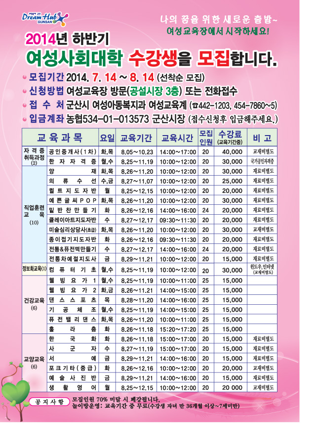접 수 처 ; 군산시 여성아동복지과 여성교육계 (442- 1203, 454-7860 ~ 5)