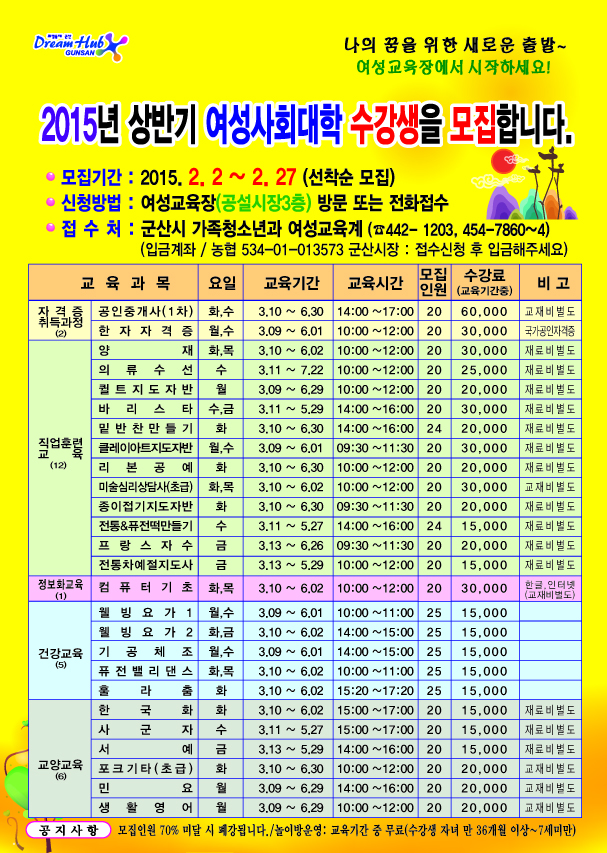 군산시 여성교육장에서는 2015년 상반기 여성사회대학 수강생을 모집합니다