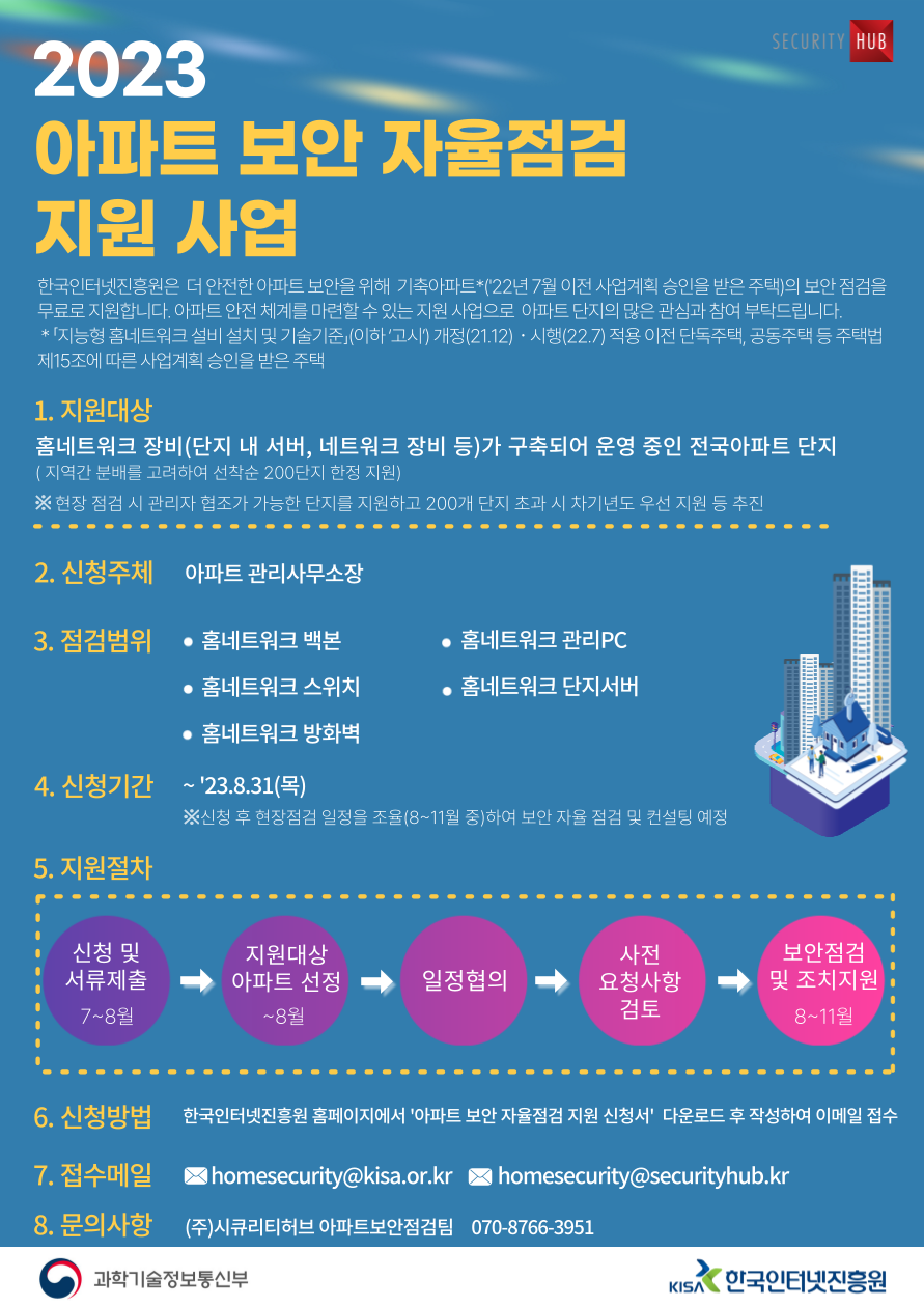 2. 과학기술정보통신부는 한국인터넷진흥원(‘KISA’)와 함께 각 시도별 아파트 단지의 홈네트워크 보안성 확보를 지원하기 위해‘아파트 보안 자율점검 지원'을 추진하고 있습니다.