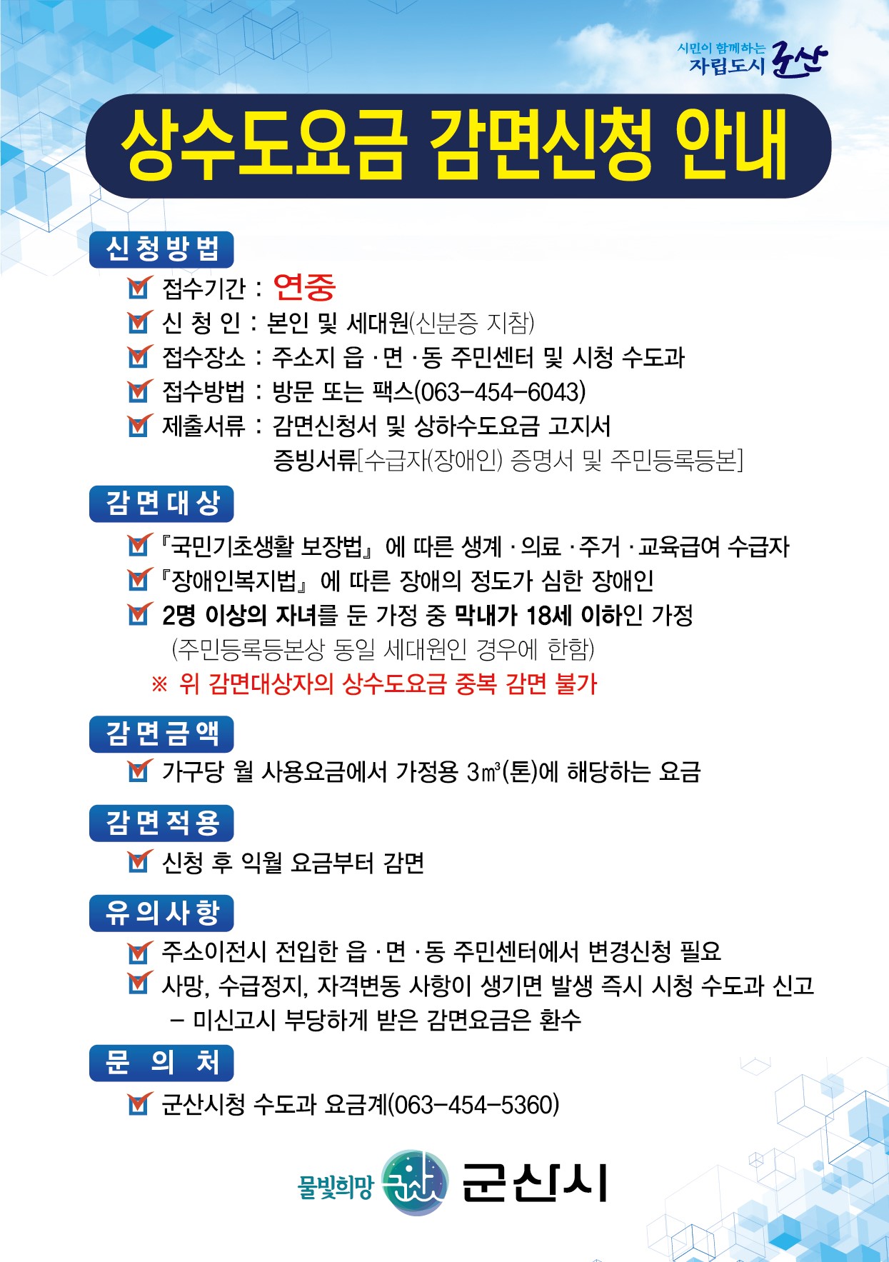 군산시에서 시행하고 있는 상수도요금 감면서비스를 다음과 같이 안내하오니