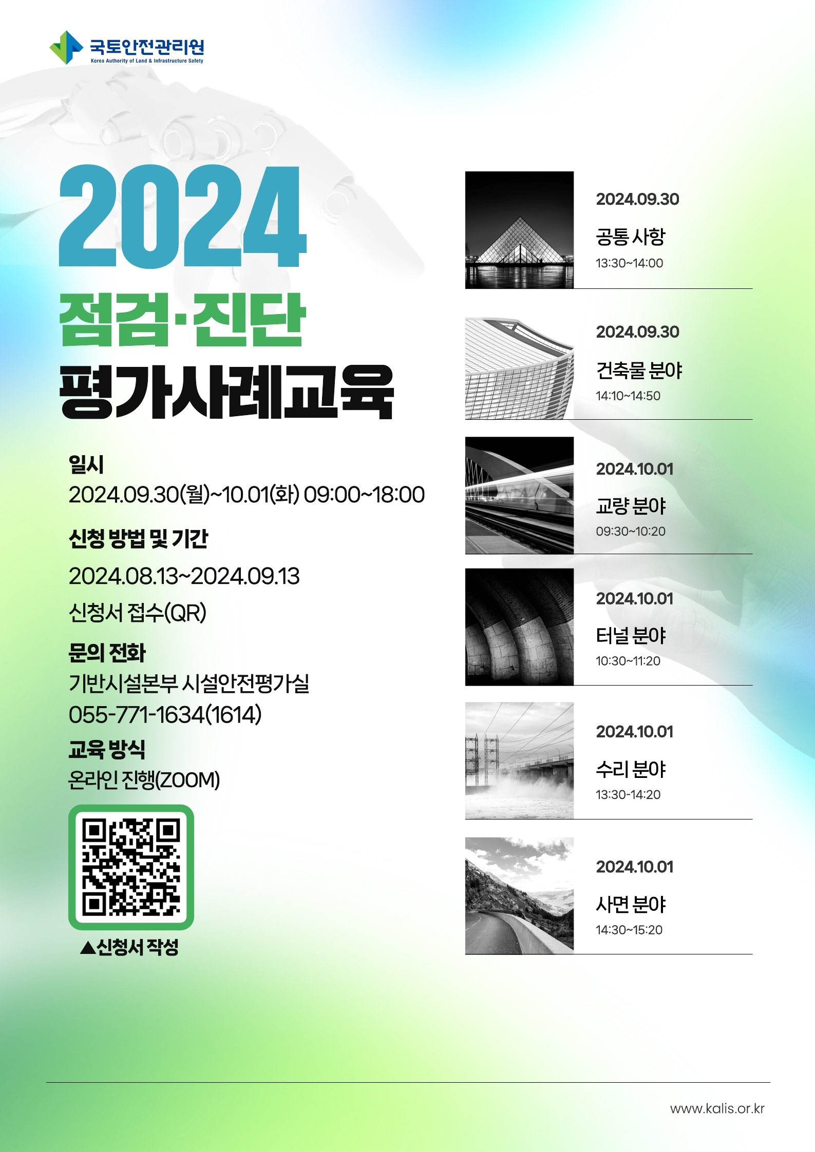 국토안전관리원에서 시행하는 “2024년도 점검·진단 평가사례 교육”을 아래와 같이 안내하오니 많은 참여 바랍니다.
