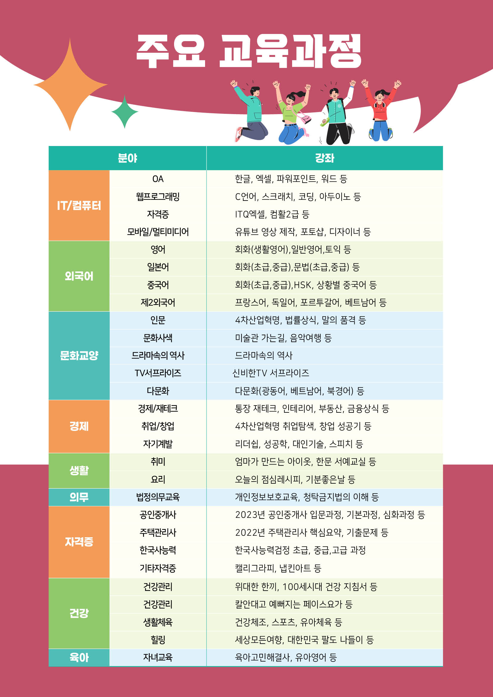- IT·컴퓨터 / 외국어 / 문화교양 / 경제 / 생활 / 법정의무교육 / 자격증 / 건강 / 육아