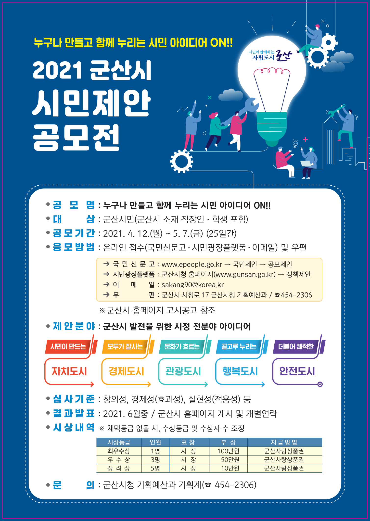 군산시 시정 핵심과제의 완성도를 높이고 차기 시정발전을 도모할 신규사업 발굴을 위한 『2021 군산시 시민제안 공모전』을 아래와 같이 실시하오니 많은 시민들의 참여바랍니다.