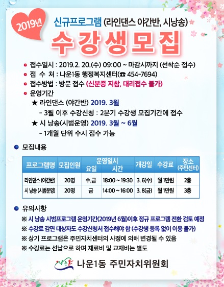 | 5 | 2019년 주민자치센터 신규프로그램 수강생모집 안내(라인댄스 야간반, 시낭송) |