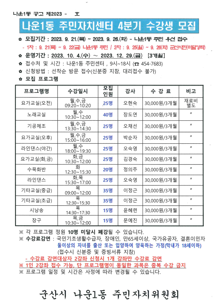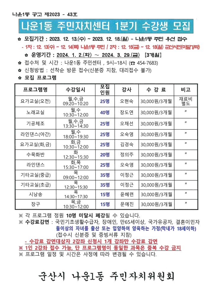 | 169 | 2023년 4분기 주민자치센터 프로그램 수강생 모집안내 |