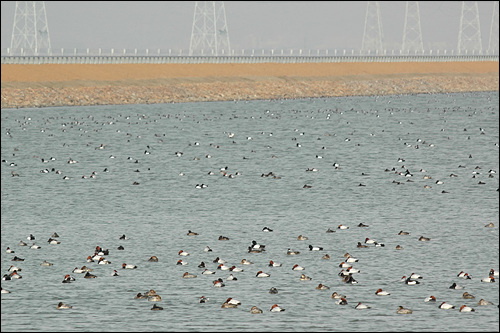 그 밖에도 다양한 물새들이 보인다. 혹부리오리와 청머리오리는 서울에선 보기 어려운 친구들이다. 한강변에서 낯익은 청둥오리, 고방오리, 홍머리오리, 흰죽지와 댕기흰죽지까지, 오리류는 총출동한 듯하다. 뿔논병아리와 물닭, 왜가리도 빠지지 않는다.