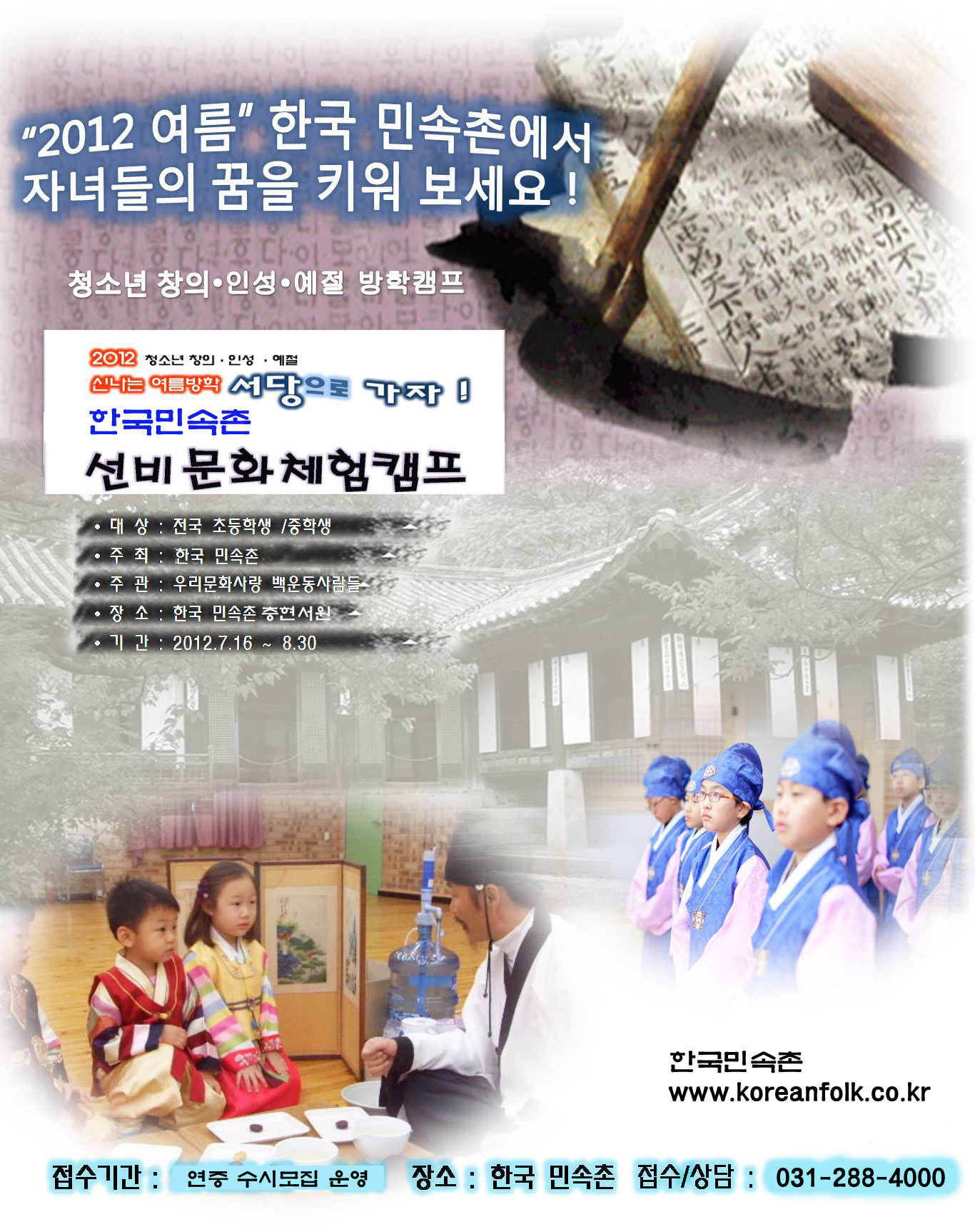 “2012 여름방학” 한국민속촌에서 훈장님과 함께하는 선비문화체험 수련캠프 !
