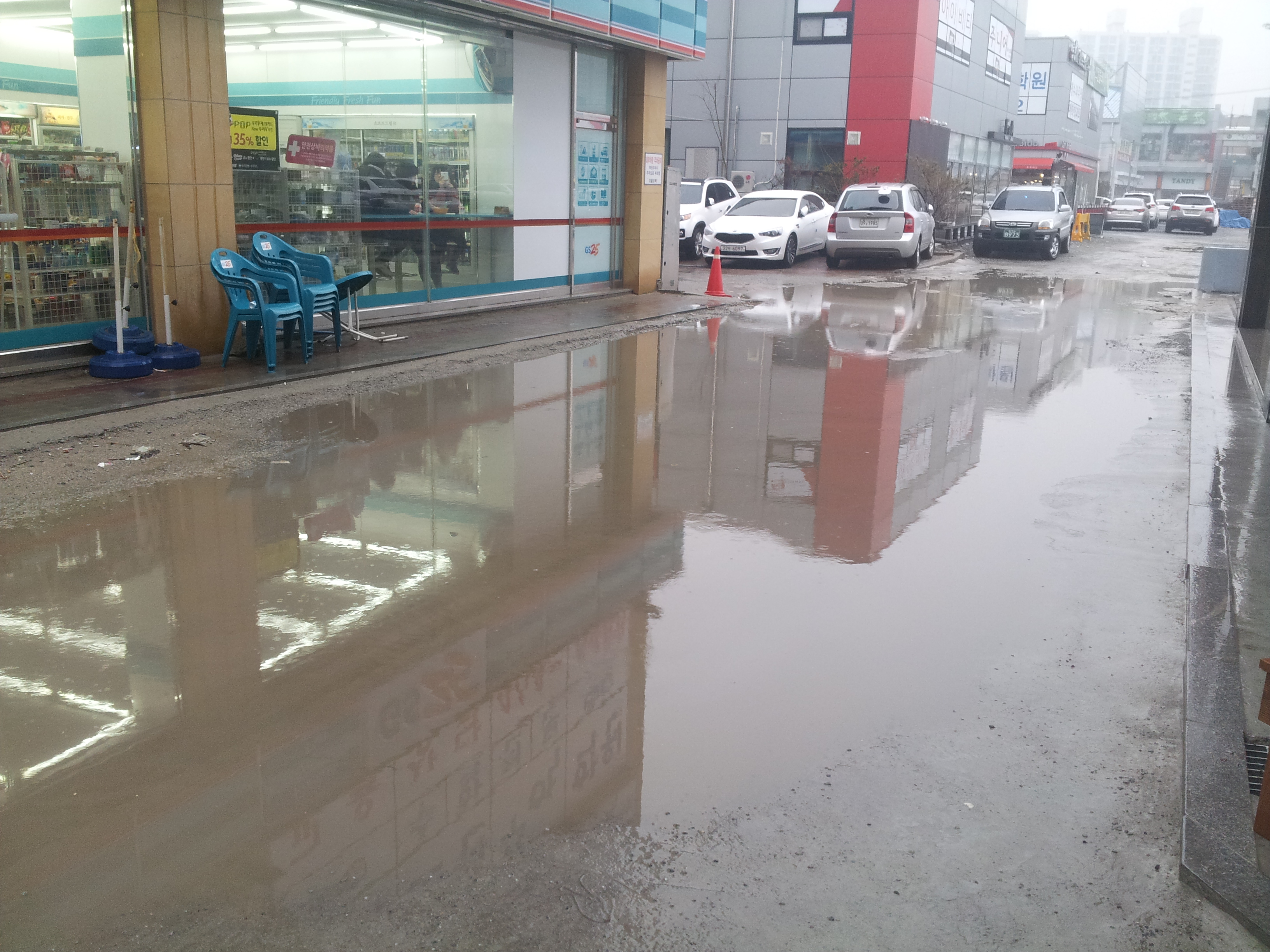 지금 계절이 겨울인데 길 자체가 침수가 되어, 마치 여름철에 비가 많이 와서 침수되어 있는 느낌이였습니다. 도보로 지나는 행인도 사이드로 걷고 있었습니다.