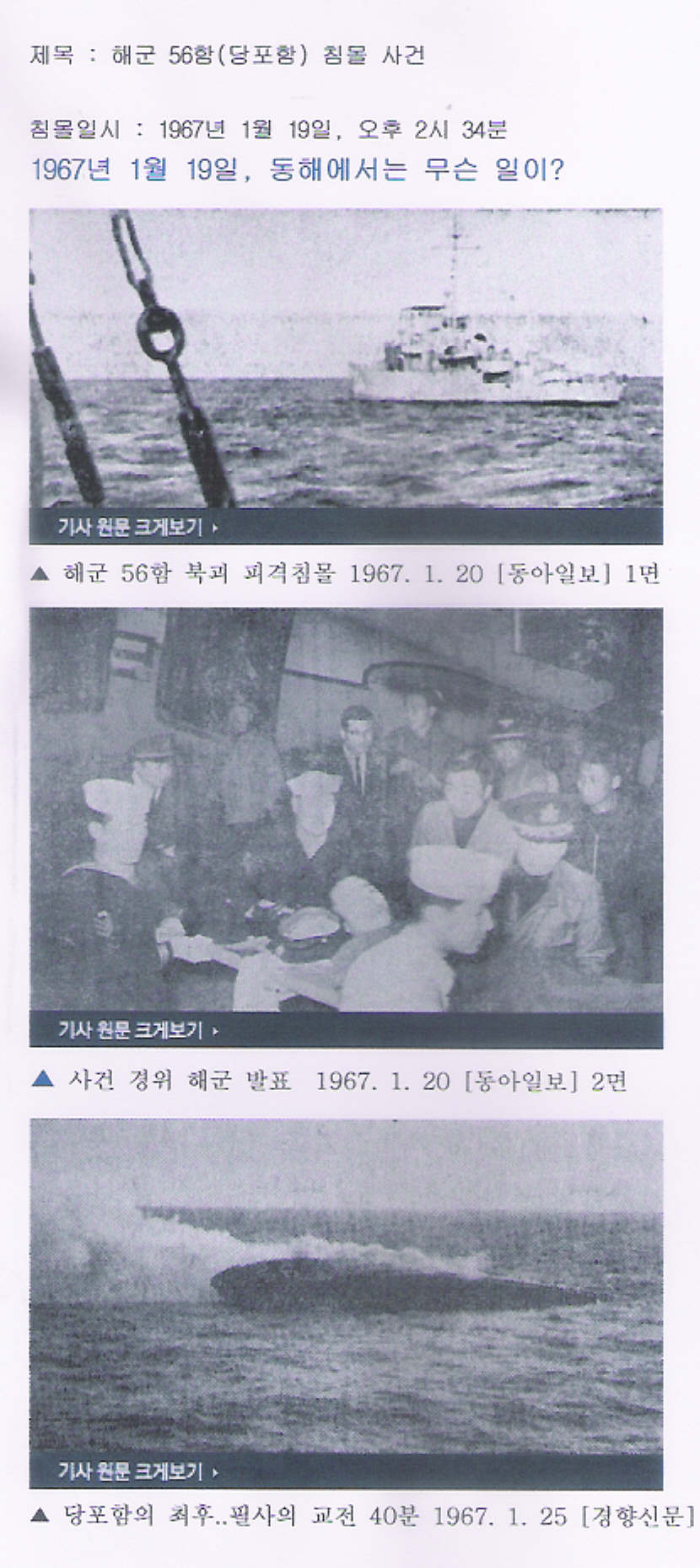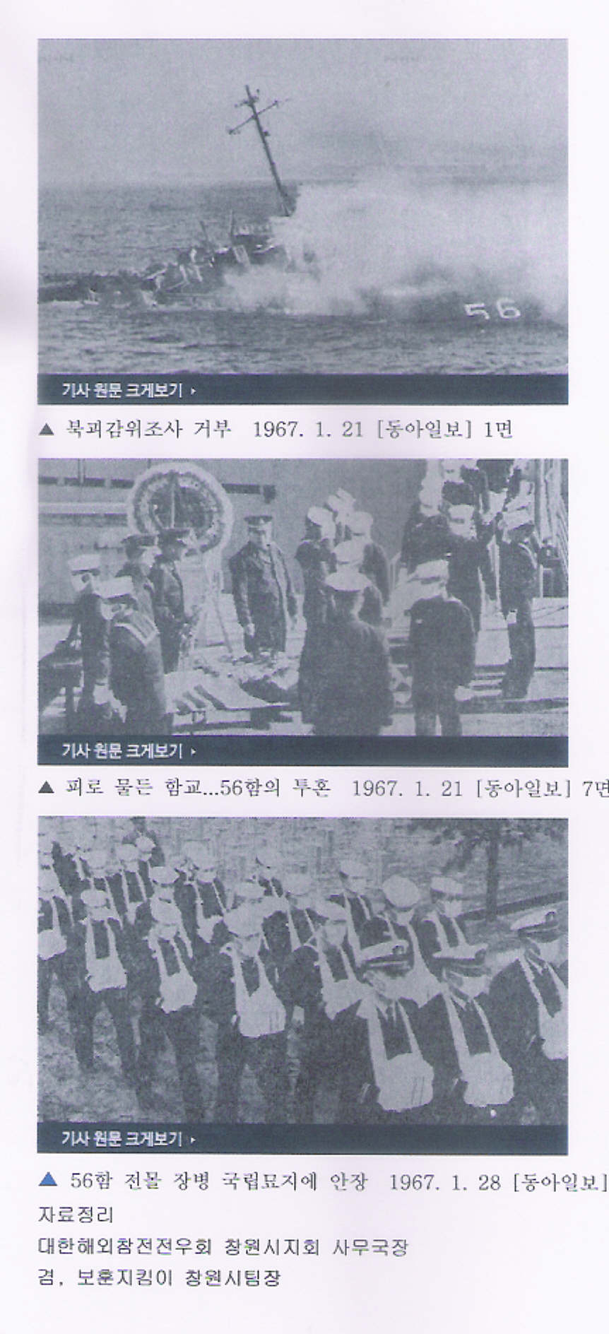 56함 참사는 1월 말까지는 그래도 언론에 보도됐으나 2월 들어 급격히 자취를 감췄다. 67년 말 어로저지선에서 조업하던 어선 39척과 어부 340여명이 납북됐을 때, 또 이듬해 해군 방송선이 납북됐을 때 56함의 기억이 다시 국민에게 살아났다. 그러나 잠시뿐이었다. 지금도 동해바다 북위 38도39분45초, 동경 128도26분48초 해저에는 56함이 잠자고 있다.(첨부 사진 참조)