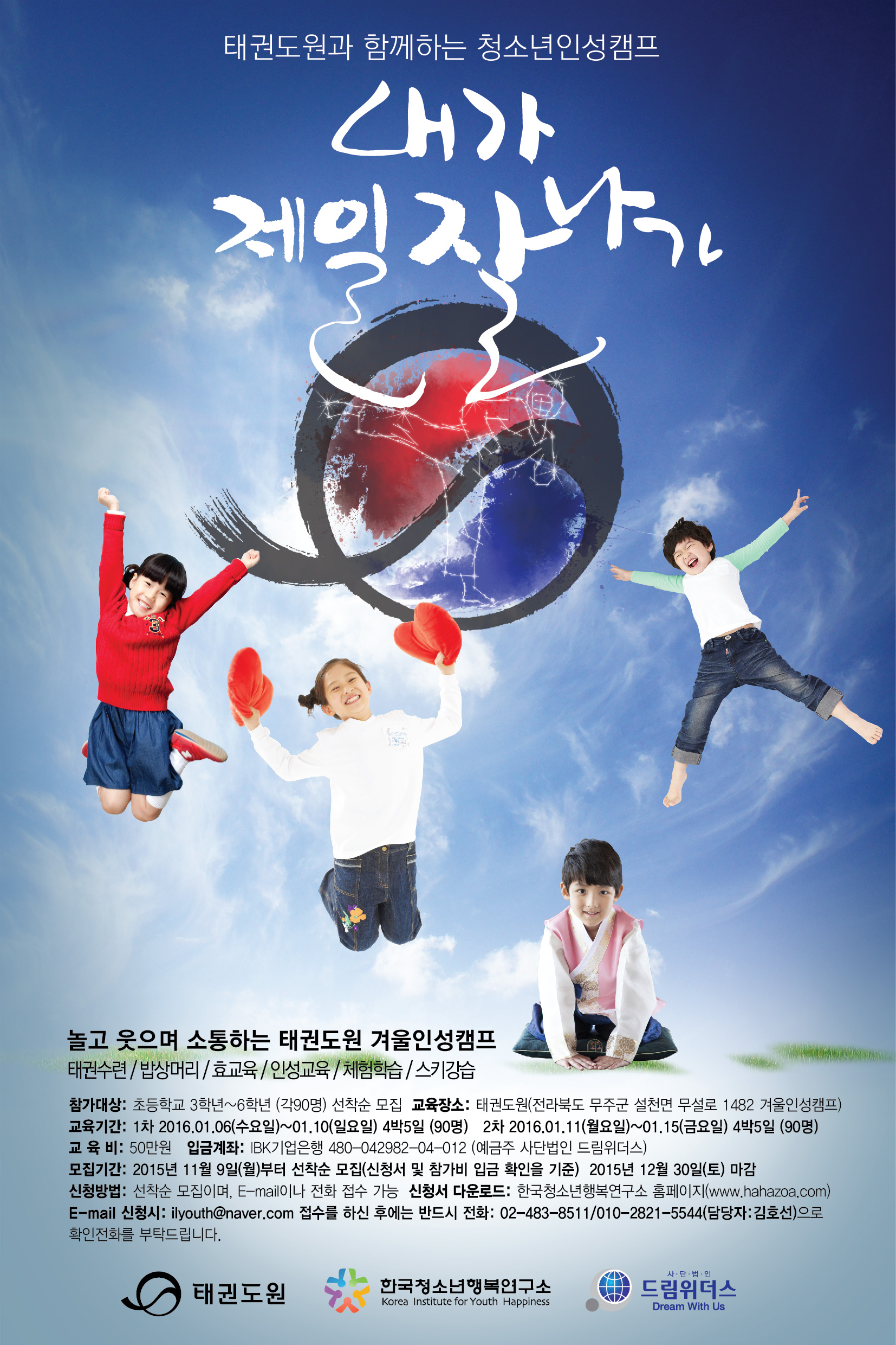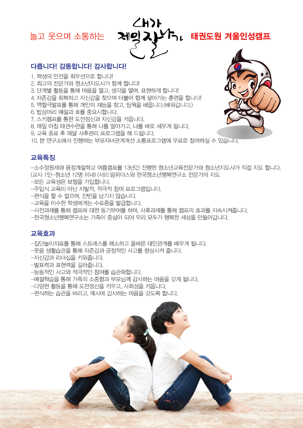 한국청소년행복연구소가 자랑하는 13년 전통의 자녀사랑 인성교육이 무주 태권도원과 함께 태권도 수련을 접목하여 인성교육 밥상머리교육, 효교육, 리더십 다양한 체험거리와 보너스 스키강습까지 최고의 시설과 최고의 프로그램으로 여러분을 초대합니다:D
