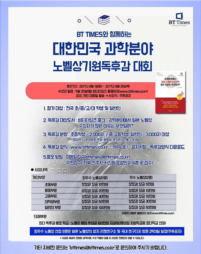 본 독후감대회를 통해 향후 대한민국 최초 과학분야 노벨상을 수상할 청소년들의 관심과 소양을 높이고자 합니다.
