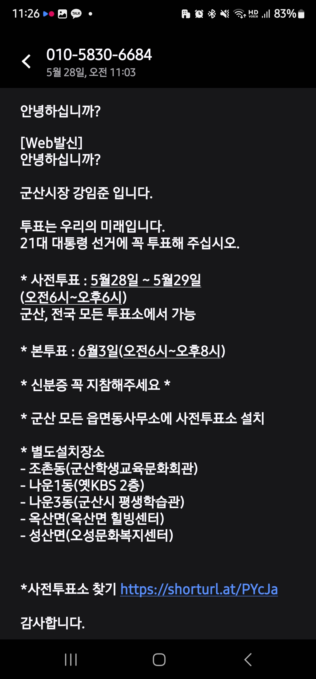 스미싱 문자일지 몰라 사전투표소 찾기 인터넷주소는 클릭하지 않았는데