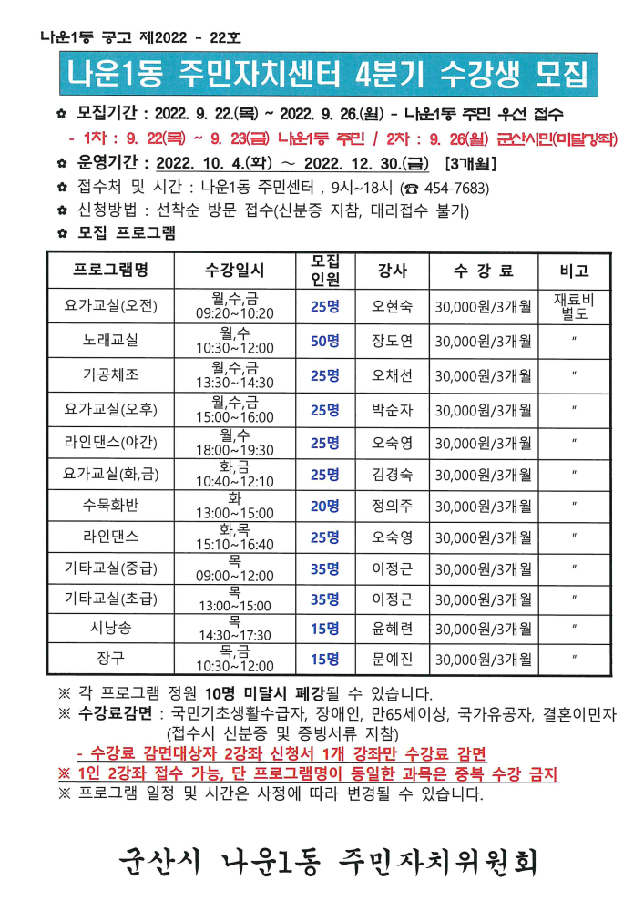| 18 | 나운1동 4분기 주민자치 프로그램 수강생 모집 안내 |