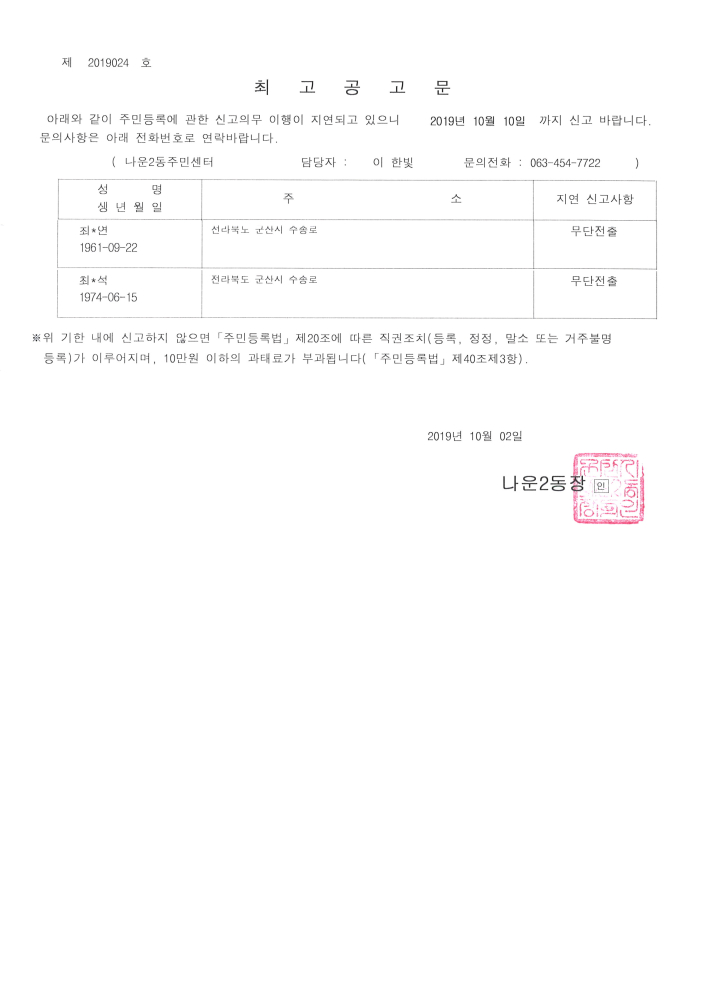 | 34 | 주민등록 신고의무 지연자 최고공고 |