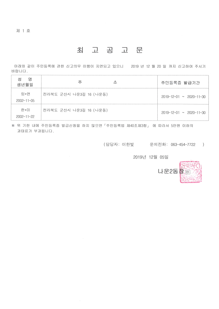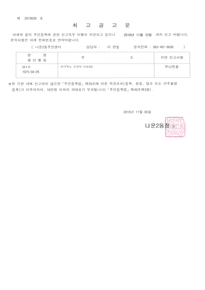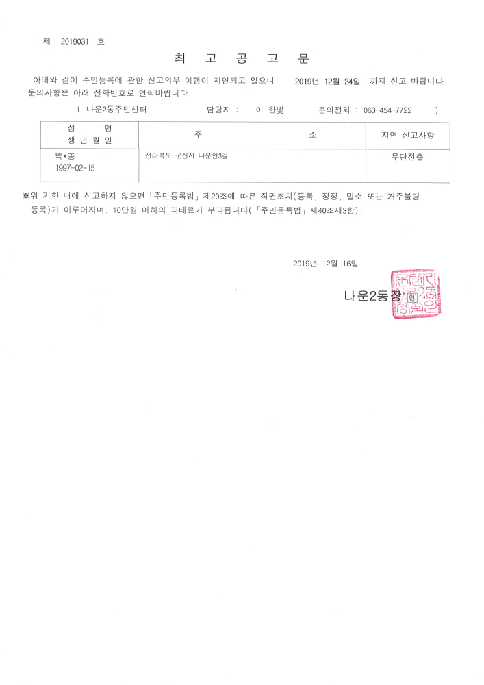 | 31 | 주민등록 신고의무 지연자 최고공고 |