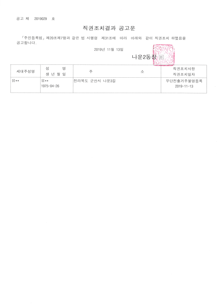| 30 | 2019년 3/4분기 주민등록 사실조사 추진계획에 따른 직권조치결과 공고 |