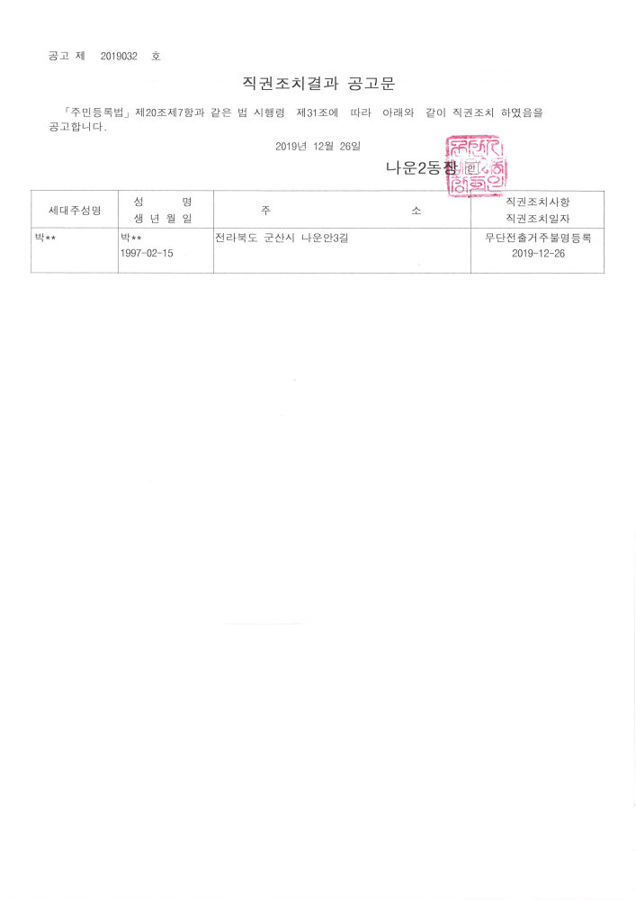 | 32 | 주민등록 신고의무 불이행자 직권조치결과 공고 |
