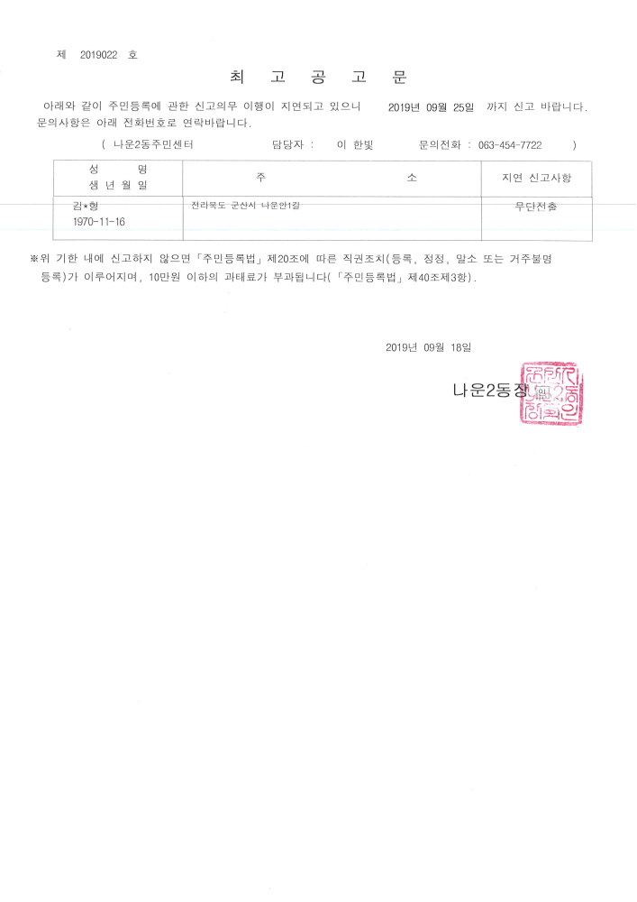 | 22 | 주민등록 신고의무 불이행자 최고공고 |